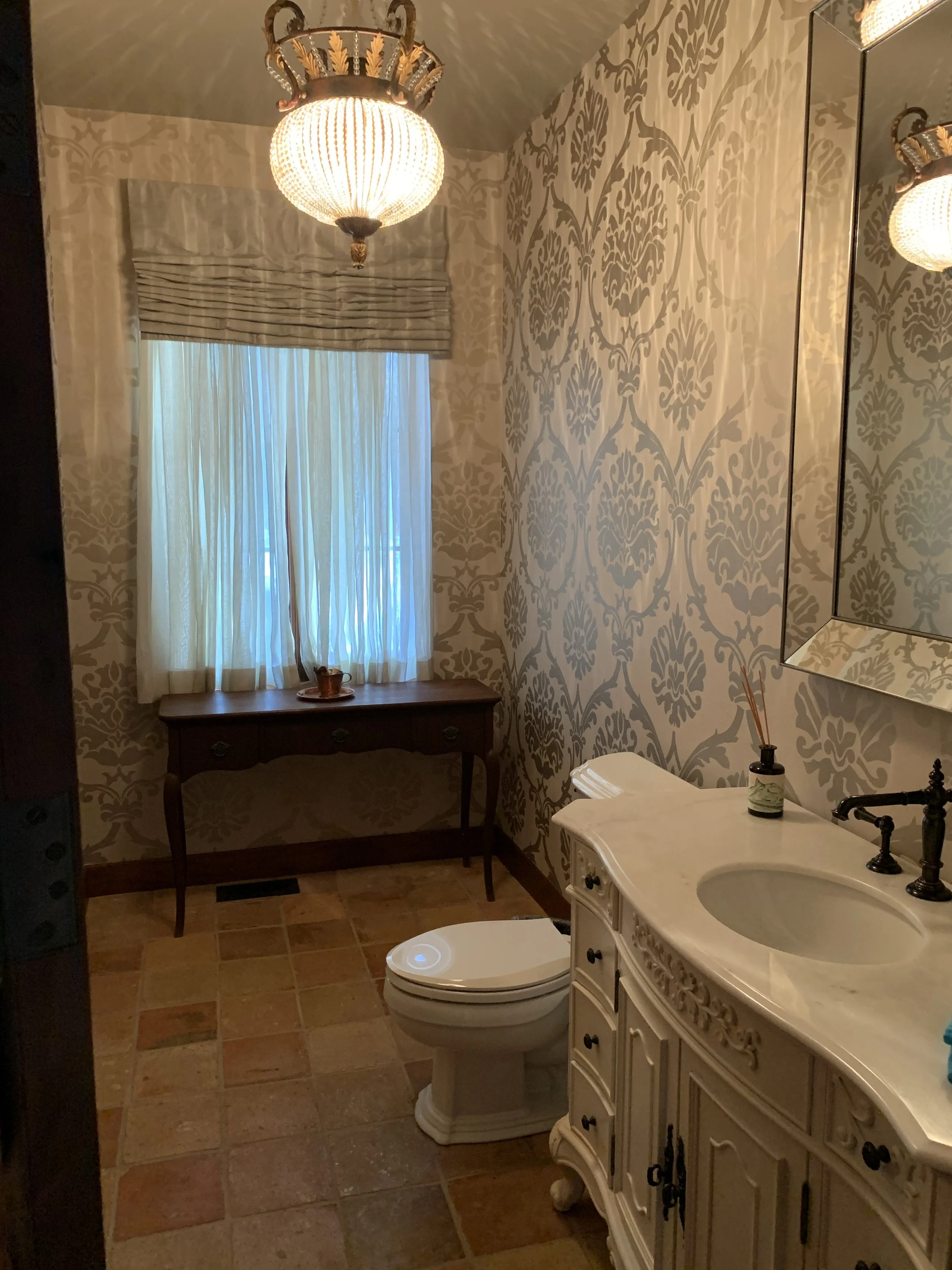 The powder room would be one of the biggest transformations on the project. The space allowed for a much larger vanity, which we were excited to design with a modern look. The wallpaper, window treatments, and light fixture needed to be updated with more contemporary selections.