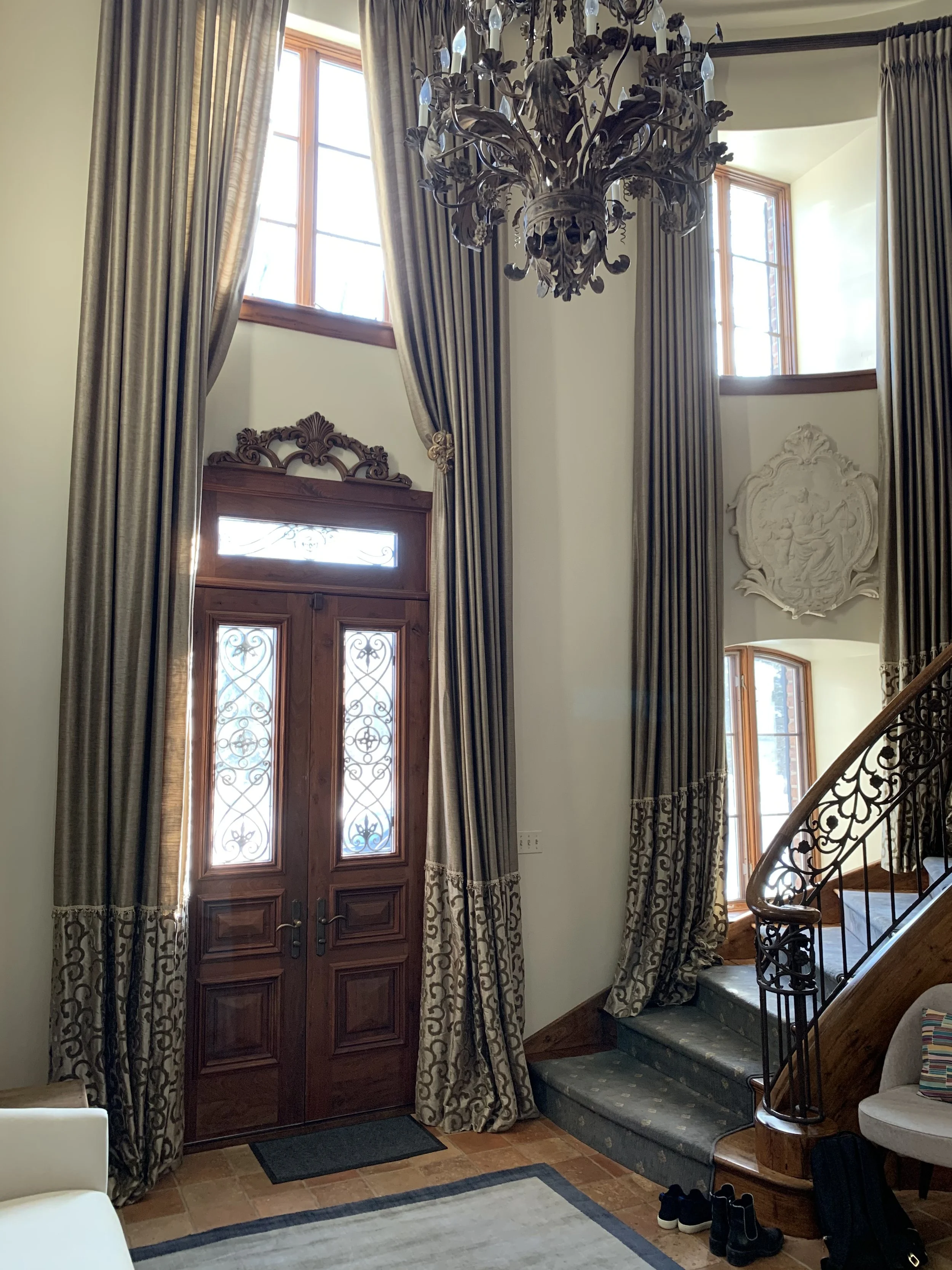 We discarded the existing damask drapery and introduced modern ripplefold drapery and sheers instead. The woven drapery fabric creates a formal look in the room while maintaining a modern feel. We opted to add a layer of white sheers to soften it up and allow natural light to filter through.