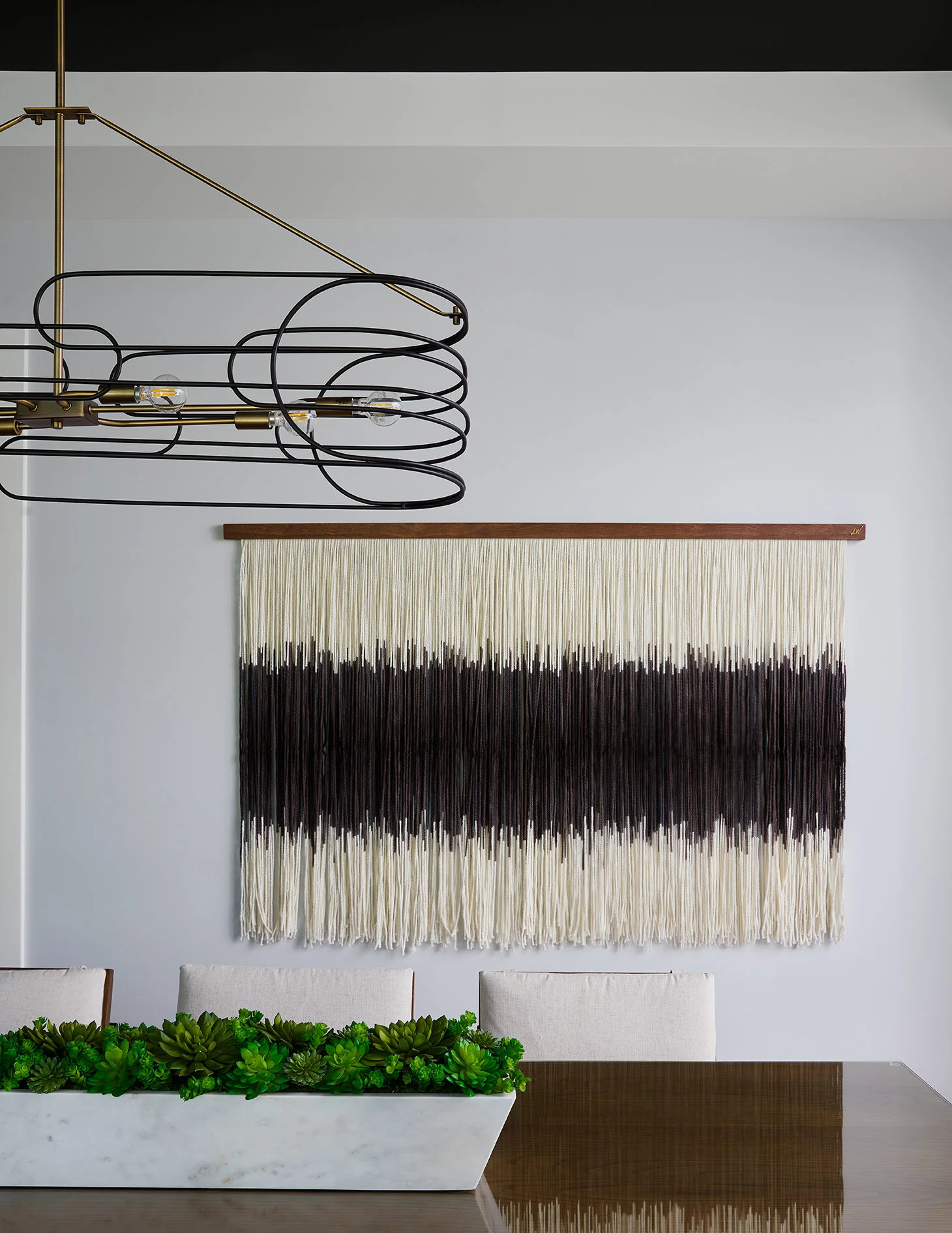 A minimal yet sculptural chandelier pulls more texture into the room while mimicking the lines in the chairs.