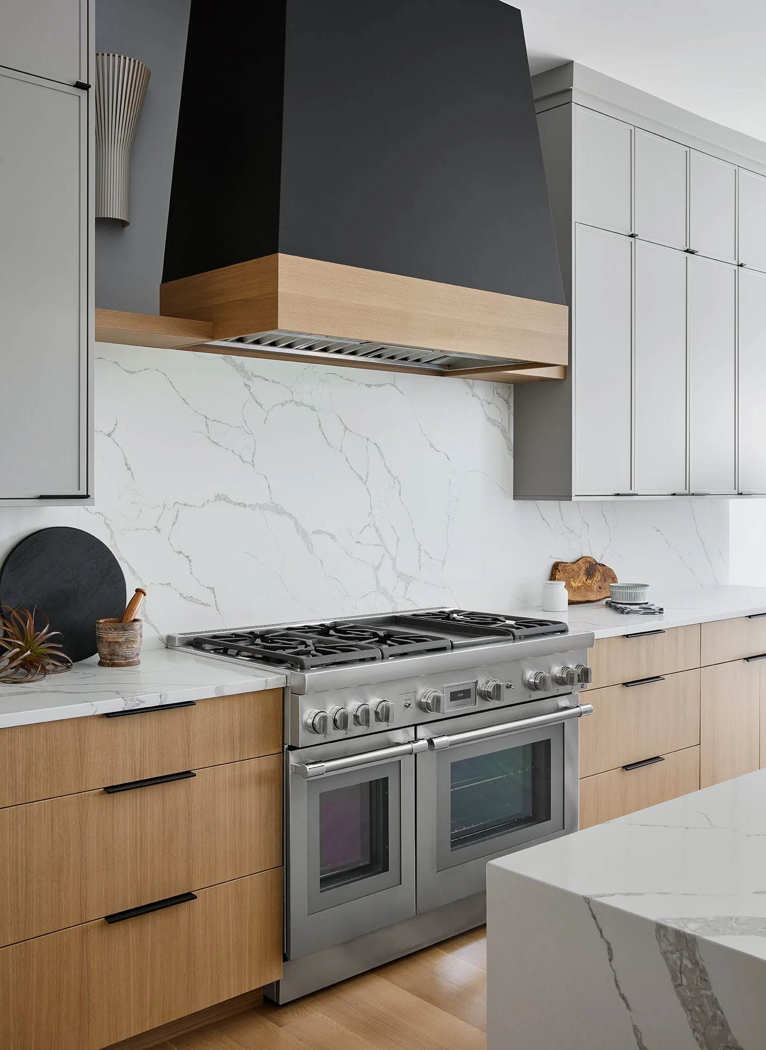 The large statement hood is painted a charcoal color, matching the island cabinetry to add depth and break things up. Sconces on either side pull in a delicate texture and mimic the lines in the counterstools.