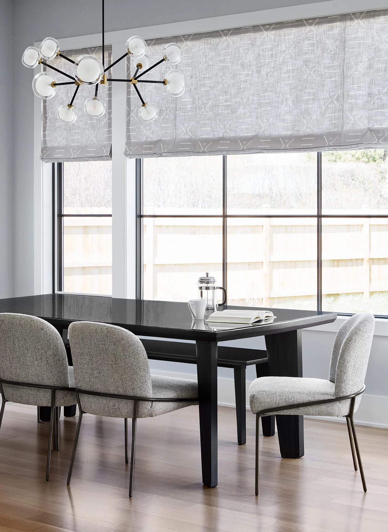 In the adjacent breakfast area, we pulled in a black, sculptural wood table with a coordinating bench and upholstered chairs with a modern tube frame. The chandelier adds an artistic touch to the space while the mudcloth Roman shades pull in the subtle bohemian aesthetic that was introduced in the dining room.
