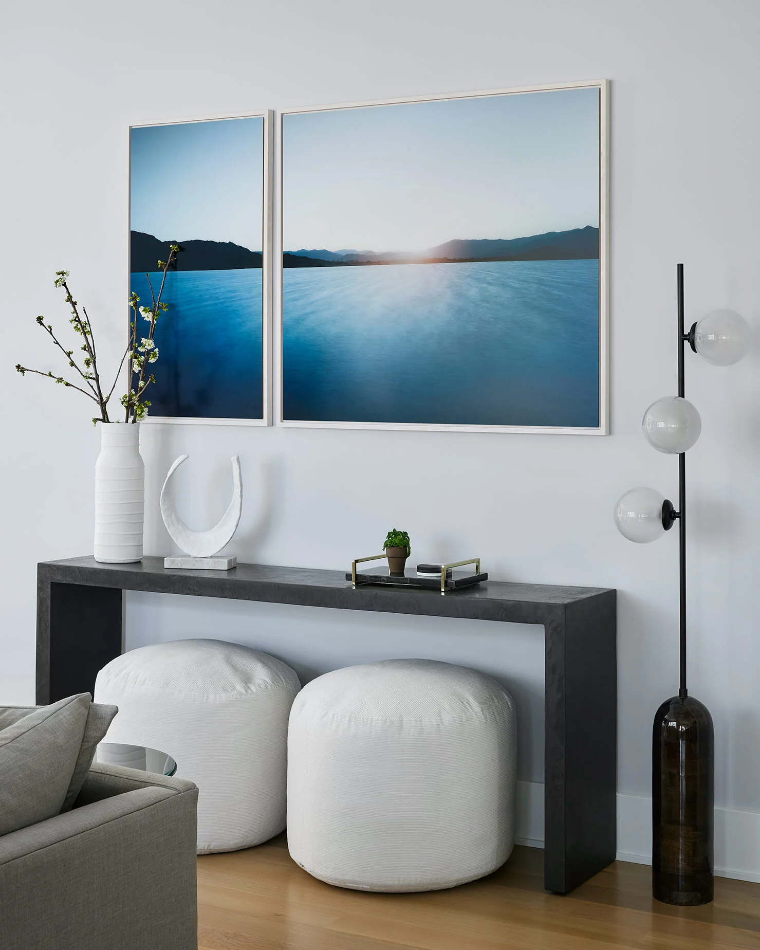 A concrete console table houses two poufs, available for additional seating or ottomans when needed. Above the table, the client’s existing artwork pulls in more earthy, rich blues and creates a dramatic focal point.