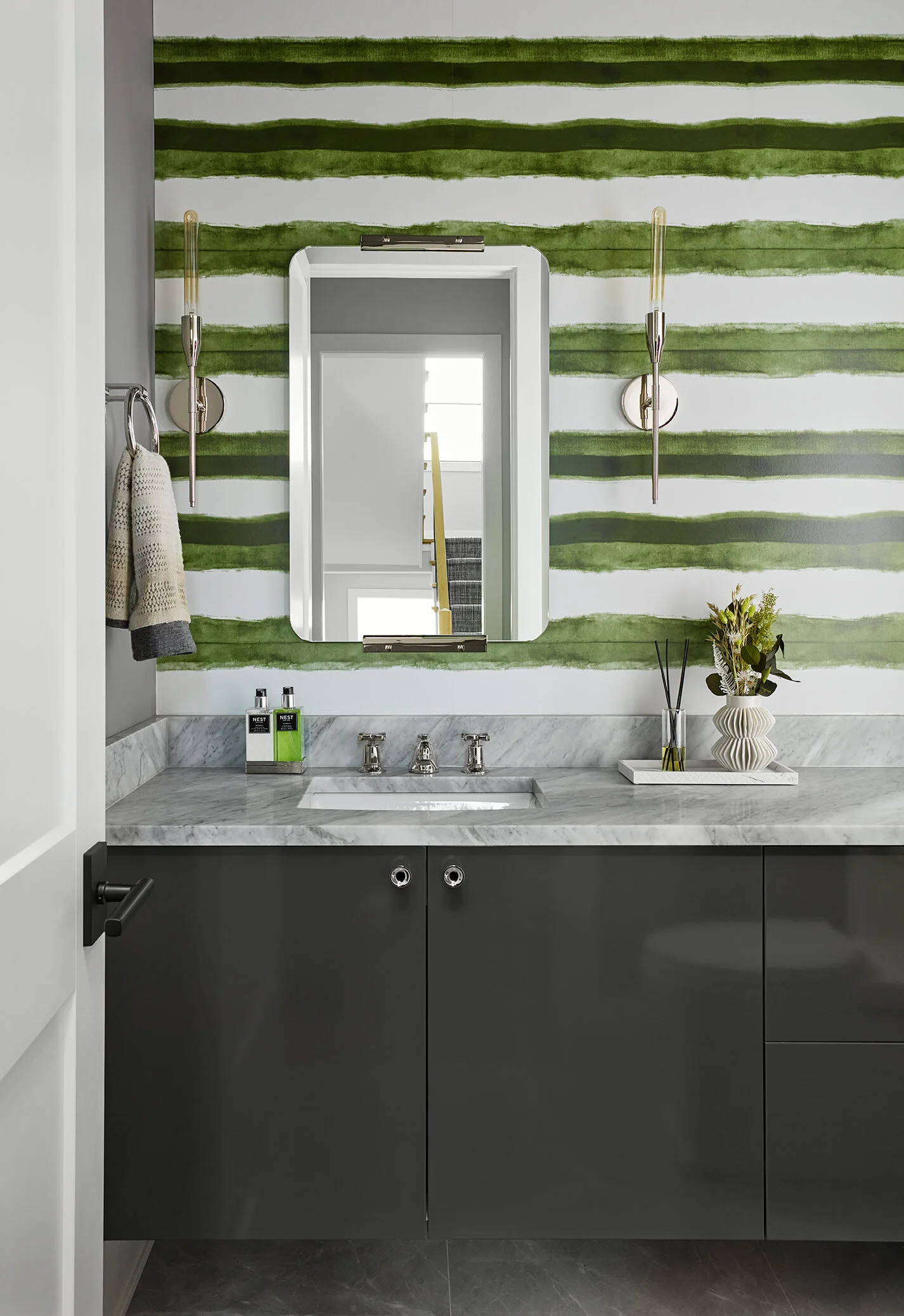 Powder rooms are always out favorite spaces to go bold. We pulled in the earthy greens from the other areas with a bold striped wallcovering and balanced it out with a high-gloss lacquered floating vanity.