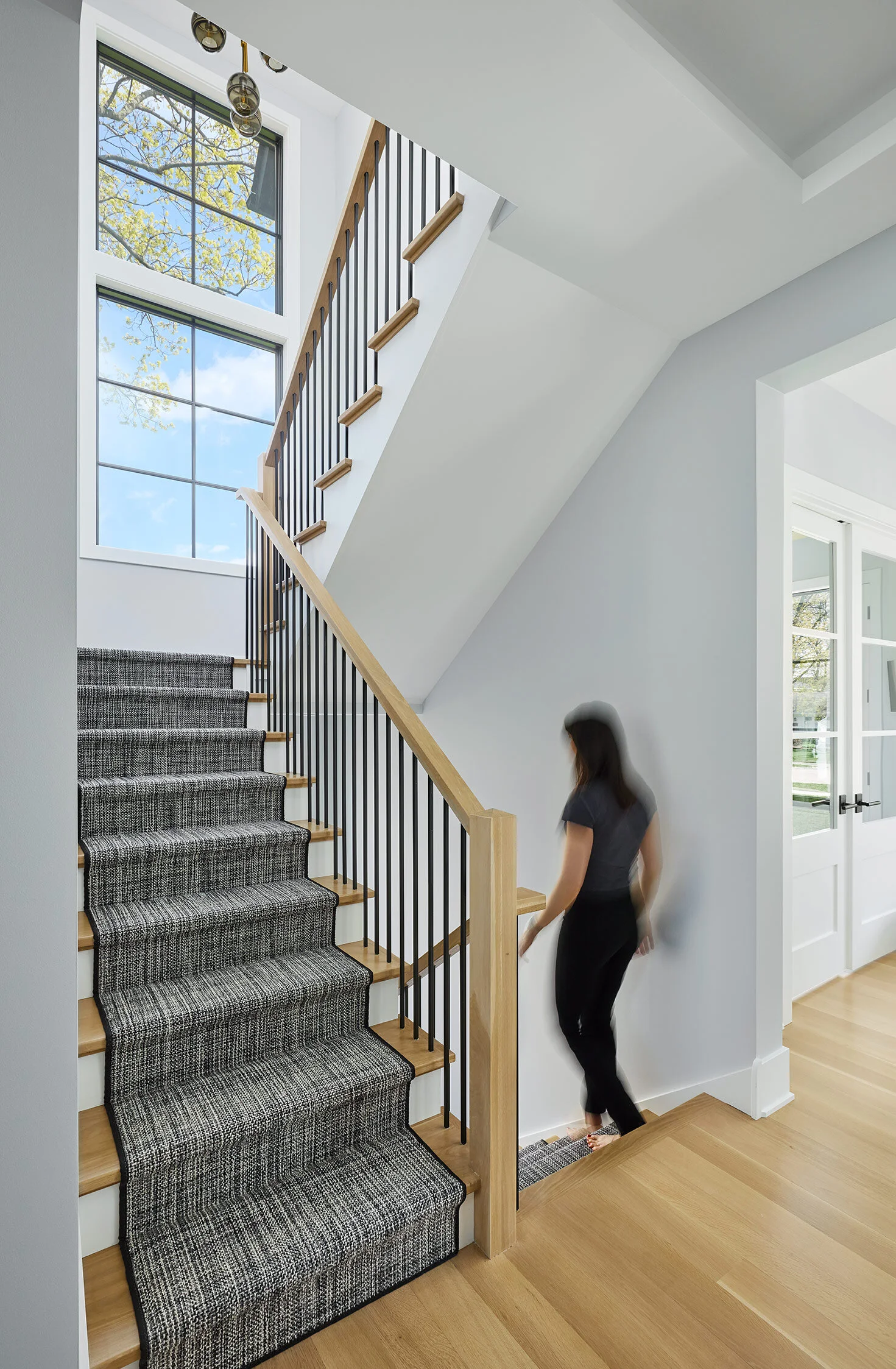 A black and white textural runner softens the staircase and pulls in some rich texture.