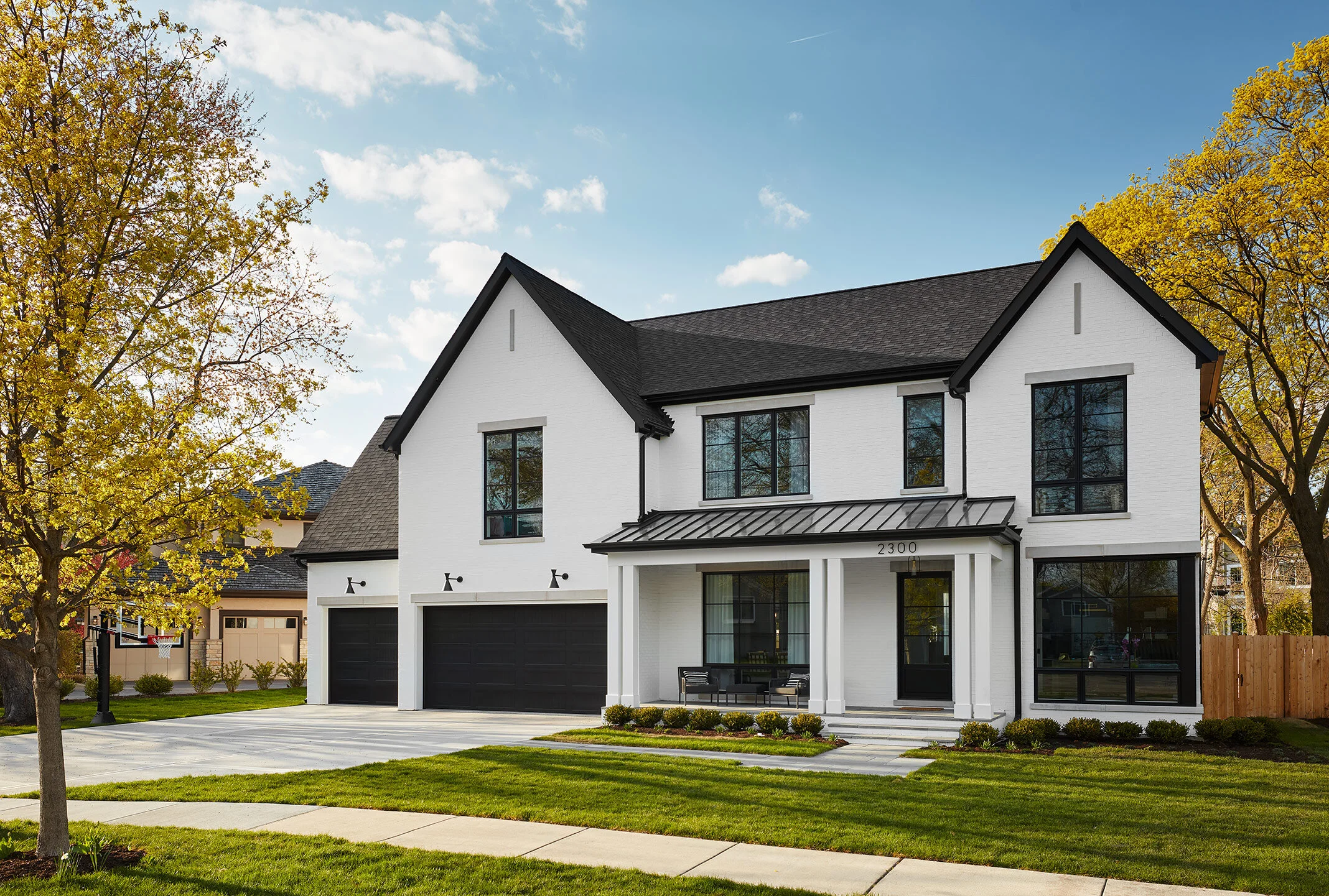 This house has multiple levels of curb appeal. Architect Louis Banks managed to celebrate both to exterior of the house and the interior all from the street with large windows framing the dramatic home office and dining room. White painted brick contrasts the crisp black windows and doors for a truly timeless look.