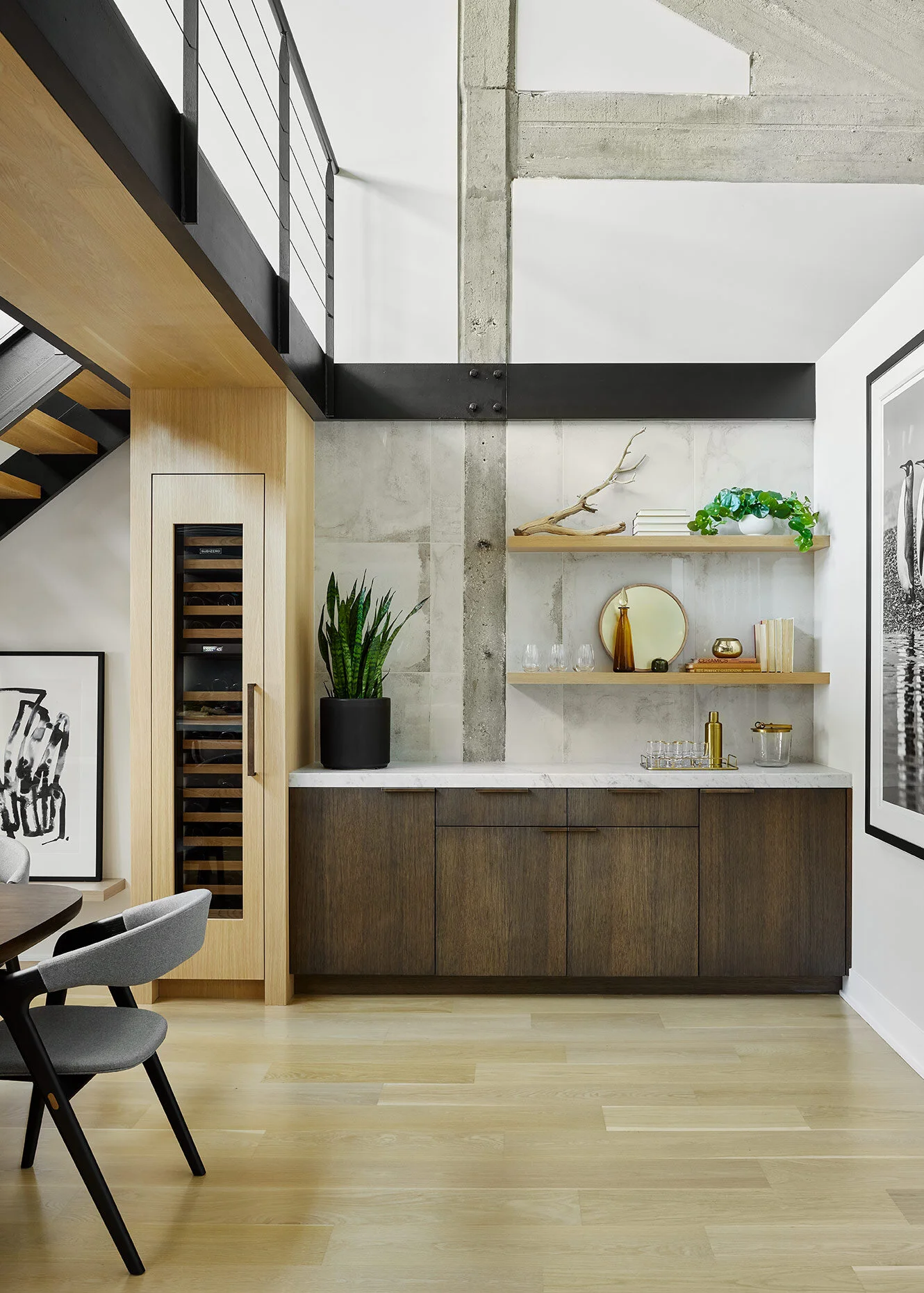 Across from the kitchen, we designed a bar for the dining room space. We used the existing stairs, metal beams, and cement columns as direction for the design of the bar. The base cabinets match the finish of the kitchen cabinets, but the wine fridge tower stands out in a lighter finish that matches the floors, which we carried onto the catwalk above it. This gives the catwalk a continuous and wrapping feel.