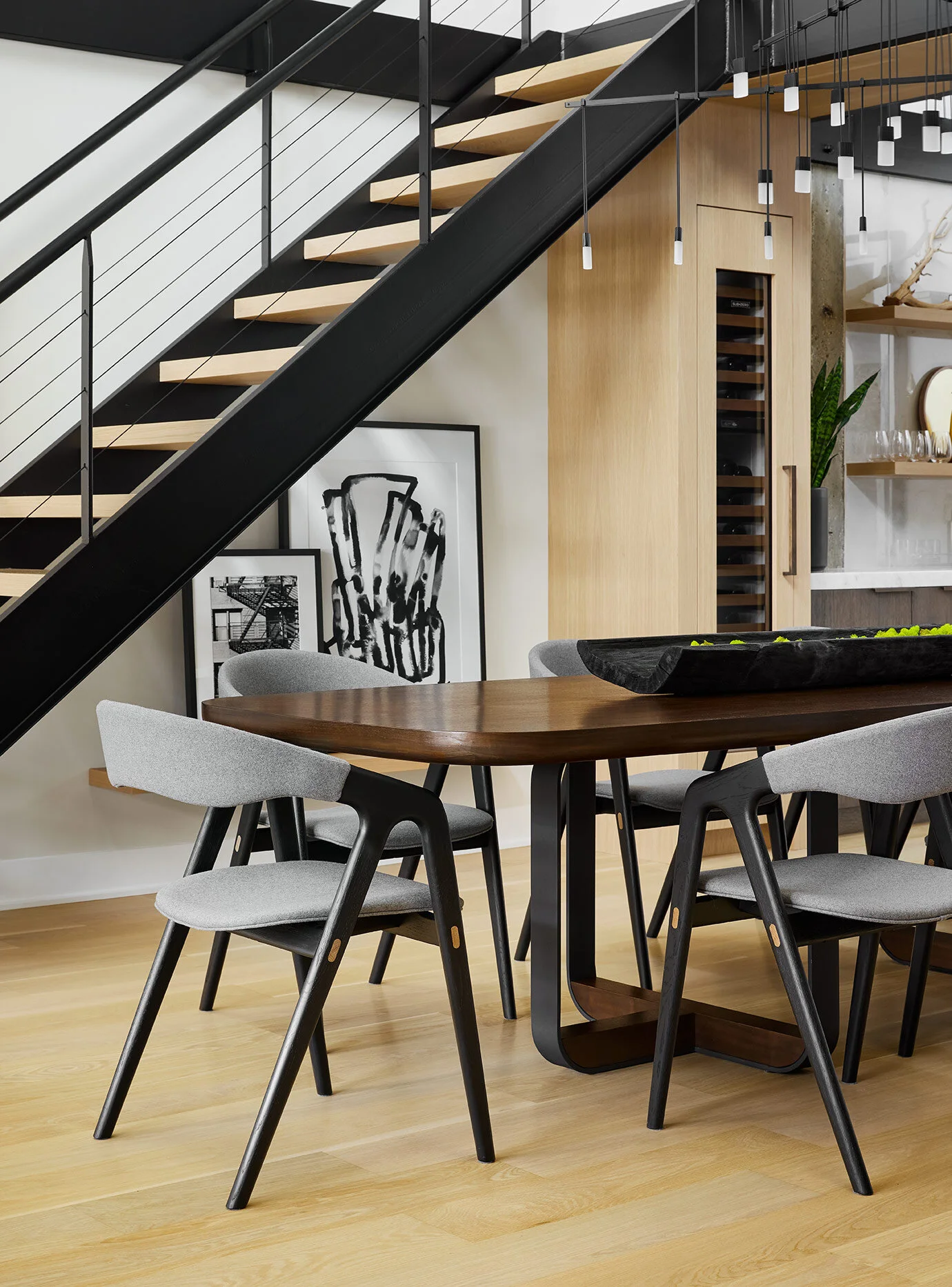 The black metal on the stairs and catwalk is contrasted by a light wood, floating stair tread. The catwalk is a defining element in the space, so the dining furniture had to be carefully selected to celebrate it. The tones of the dining table and chairs complement the black metal catwalk, while also contrasting the light wood floors, stair treads, and wine tower.