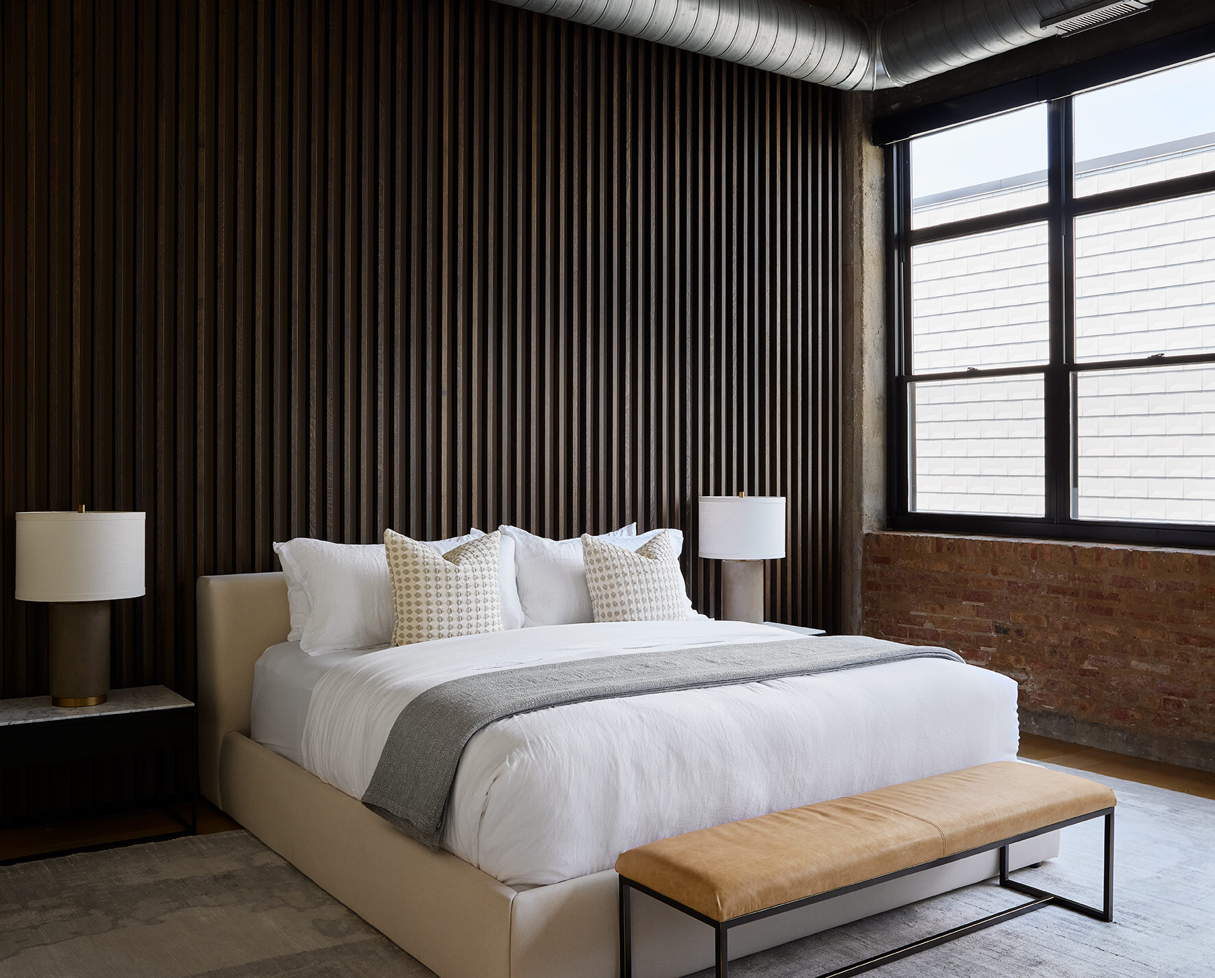 Our client was a young bachelor, so the primary suite was designed to feel masculine, understated, and hotel-like. In the primary bedroom, we kept the exposed brick, HVAC, and cement columns to celebrate the existing details and industrial character of the building. However, we opted to balance it out with sleek, modern details.
