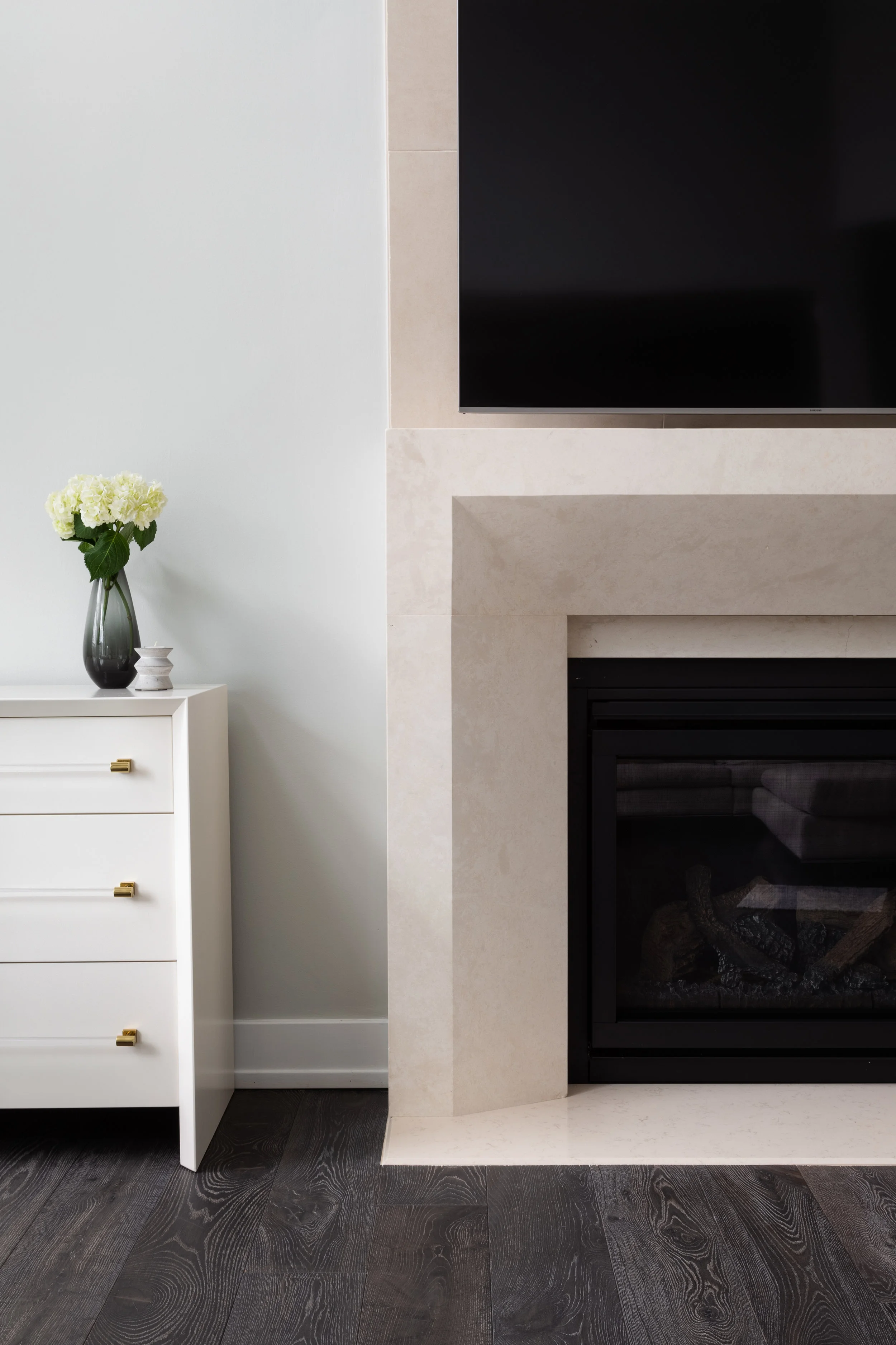 Adjacent to the kitchen is a double-height family room that truly ties the whole house together. To enhance the space, we introduced a custom stone fireplace from Paris Ceramics and carried a matching tile up to the ceiling.