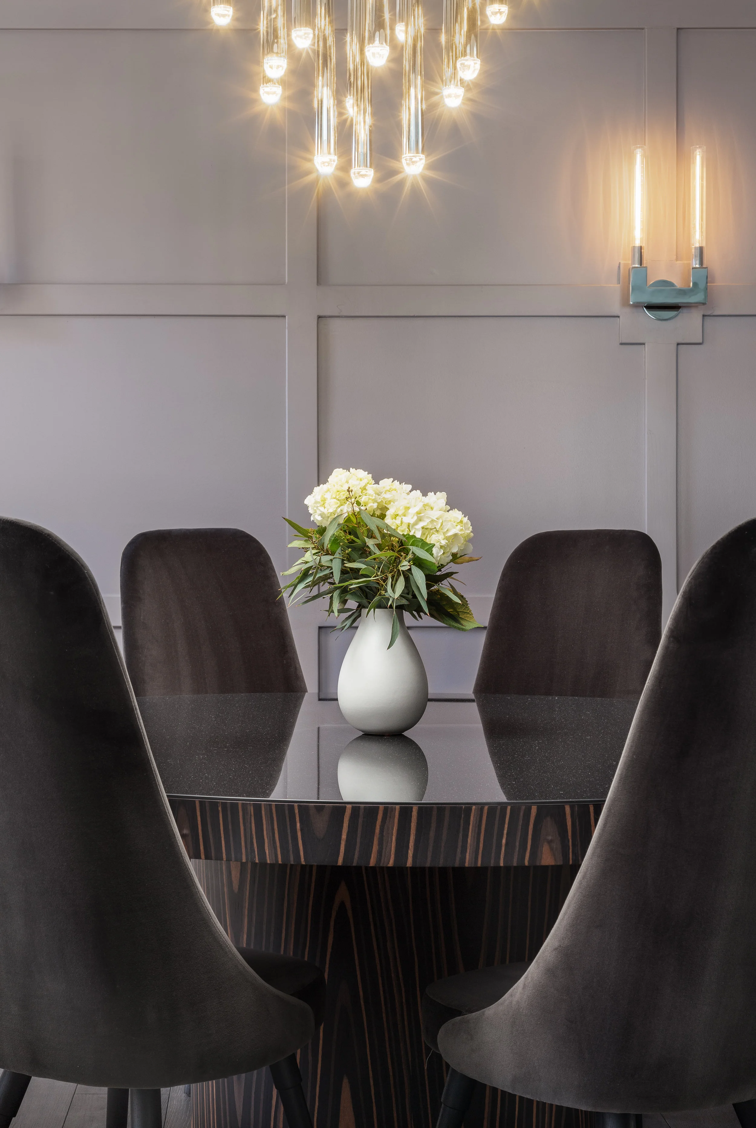 My favorite part of this house is how everything connects the moment you walk in the front door. We kept the entryway simple but paneled the wall beneath the stairs to add some texture and to tie into the elegant dining room we designed immediately next to it. In the dining room, we paneled all of the walls and painted them a rich, warm grey tone. We integrated sparkling sconces into the wall and installed a dripping chandelier above the table. Simplicity was key in this room. We wanted to add elegance without clutter and let each feature stand out on its own. The table is around ebony wood with a black mirror top, continuing the illusion of the dripping lights. To complete the room, black velvet dining chairs surround the table and add some height to the room.