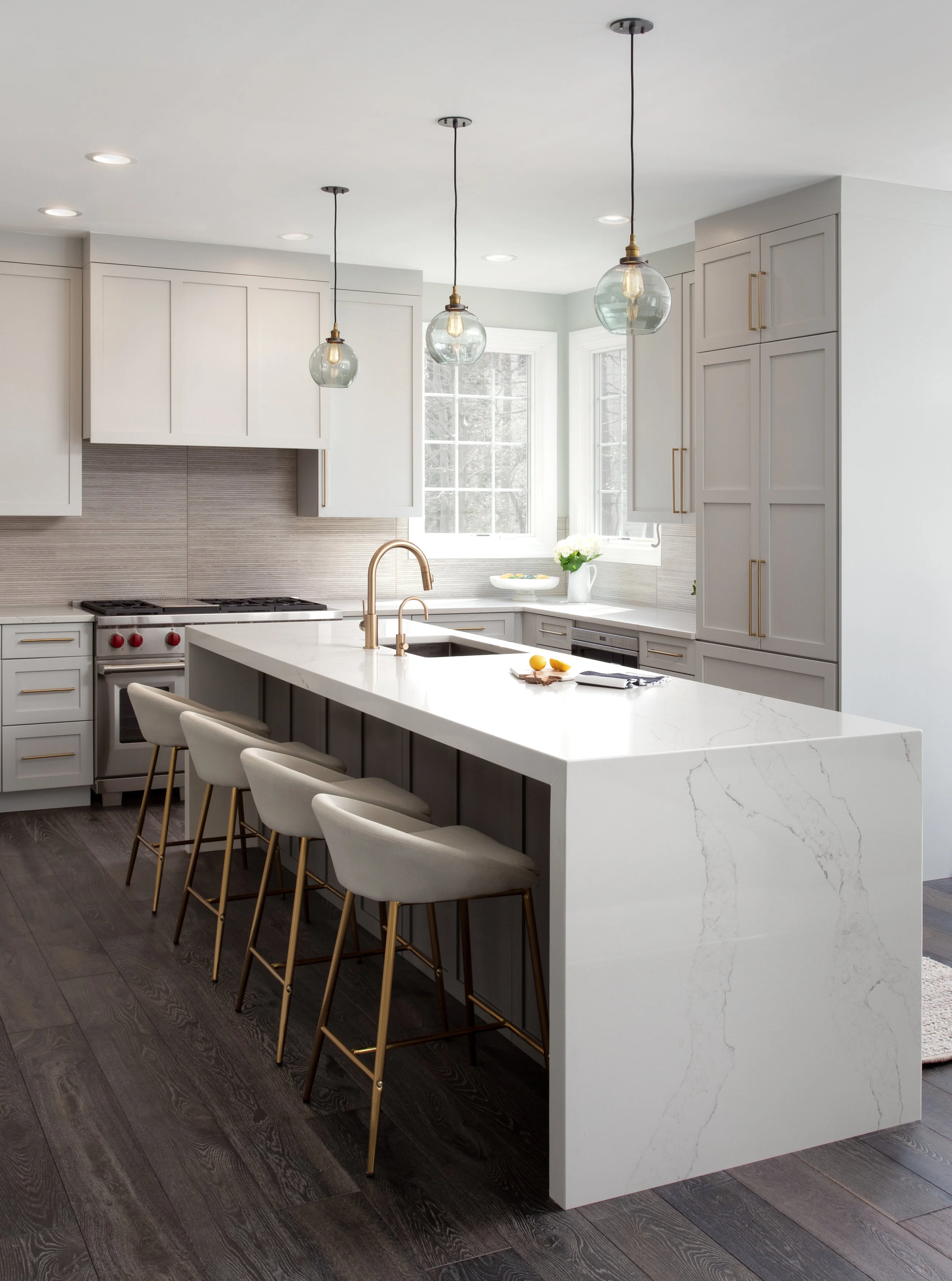 One we determined the best layout for the space, it was time to introduce the new finishes. Everything in this house originally was yellow. It felt completely outdated and needed a cooler palette to help modernize it and balance things out. We starting building the palette with dark, French Oak floors from Divine Flooring. The rich, chocolaty tones in the wood pulled in the perfect level of sophistication and warmth for the home. On top of that, we layered shades of warm grays marble textures and brass and black metal accents. The kitchen cabinets are a creamy, light gray along the perimeter with a shaker profile and a darker gray island with a waterfall quartz countertop. Brass hardware softens the palette and adds a feminine touch. We integrated all of the appliances but let the Wolf range be a focal point at the back of the kitchen with a clean, wrapped hood above it. For the backsplash, we chose a modern tile that pulls in a wood texture and adds some depth and texture to the room.
