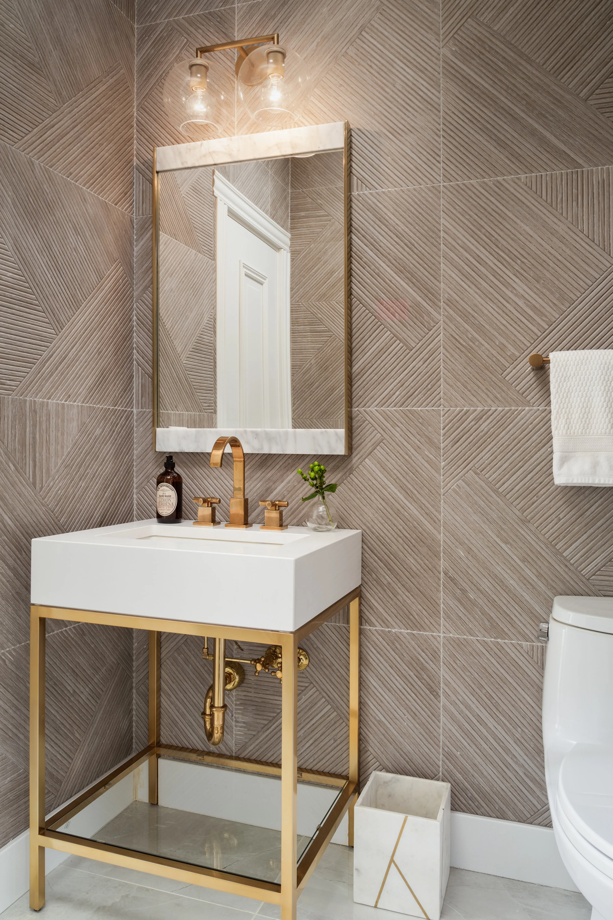 The Powder Room needed to be special. We tiled all four walls with a textural wood-looking tile that carried in the same colors and tones from the kitchen backsplash but in a more random pattern. A brass and white pedestal sink acts as jewelry in the room and is a more delicate balance from the heavy texture on the walls.