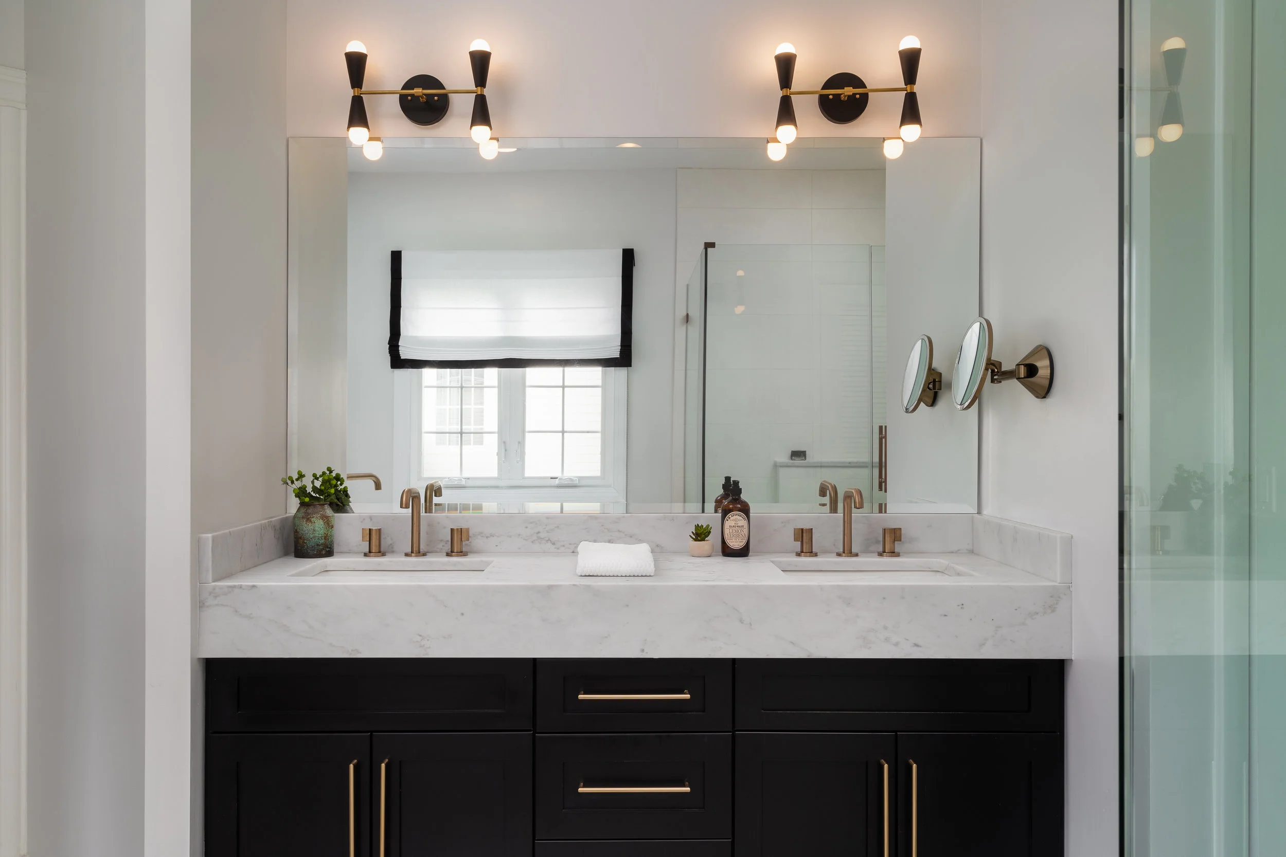 We kept the palette fresh and bright in the Jack and Jill bathroom that the two boys share. Black metal accents contrast the lighter finishes to add contrast and make it a little more masculine. We kept the cabinet profiles consistent with the kitchen cabinets to create a cohesive feel throughout the house.