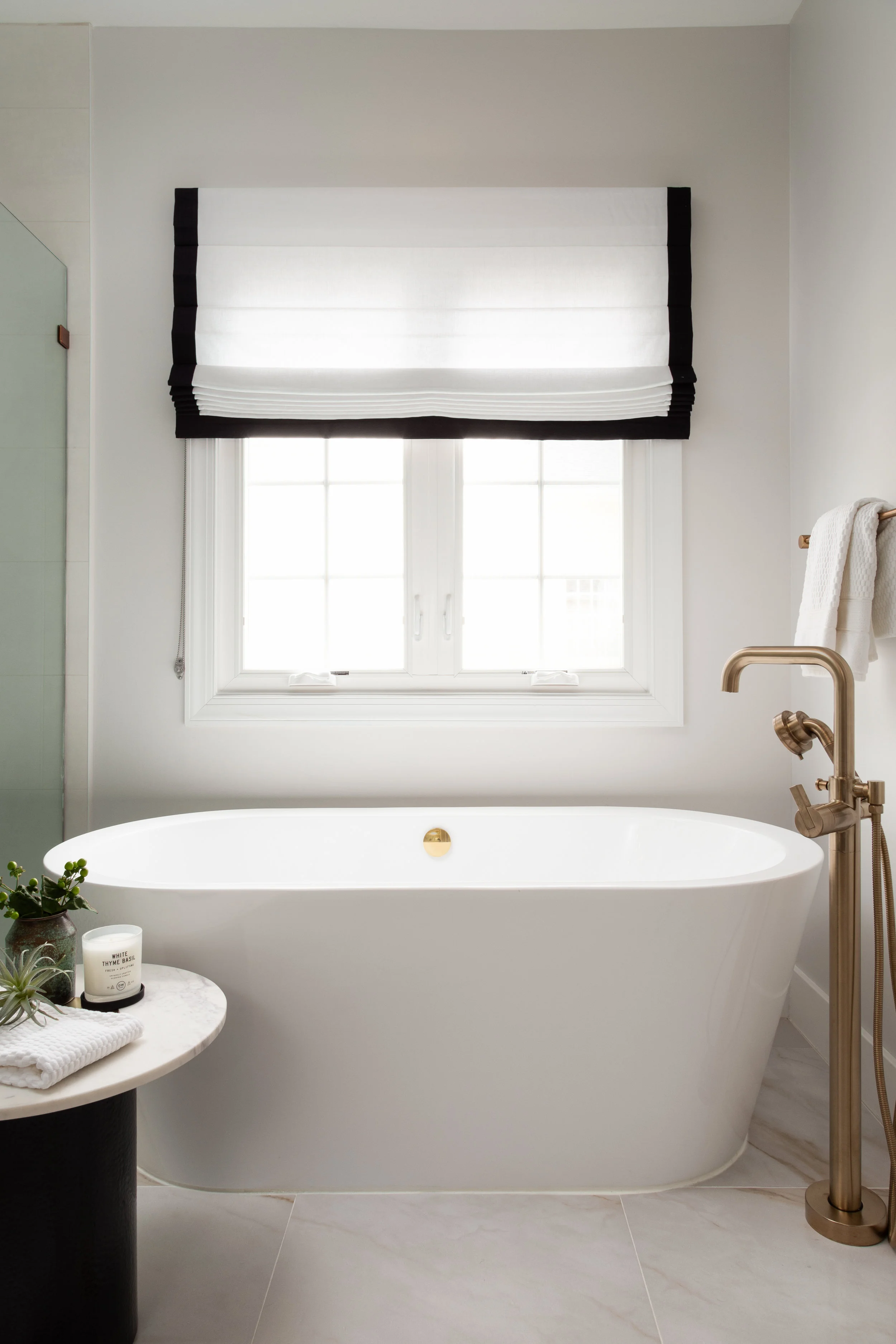 This room wouldn’t be complete without a free-standing soaking tub beneath it’s window. We added some linen roman shades for privacy with a black border to tie in with the vanity.