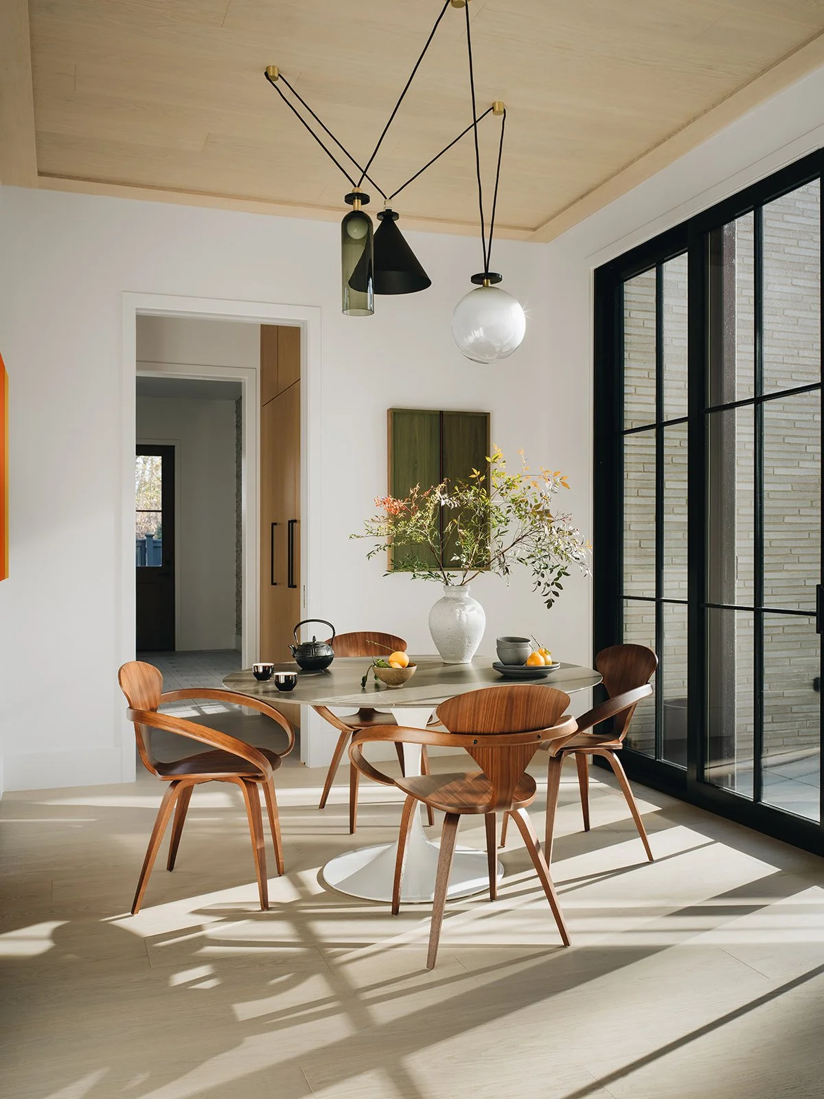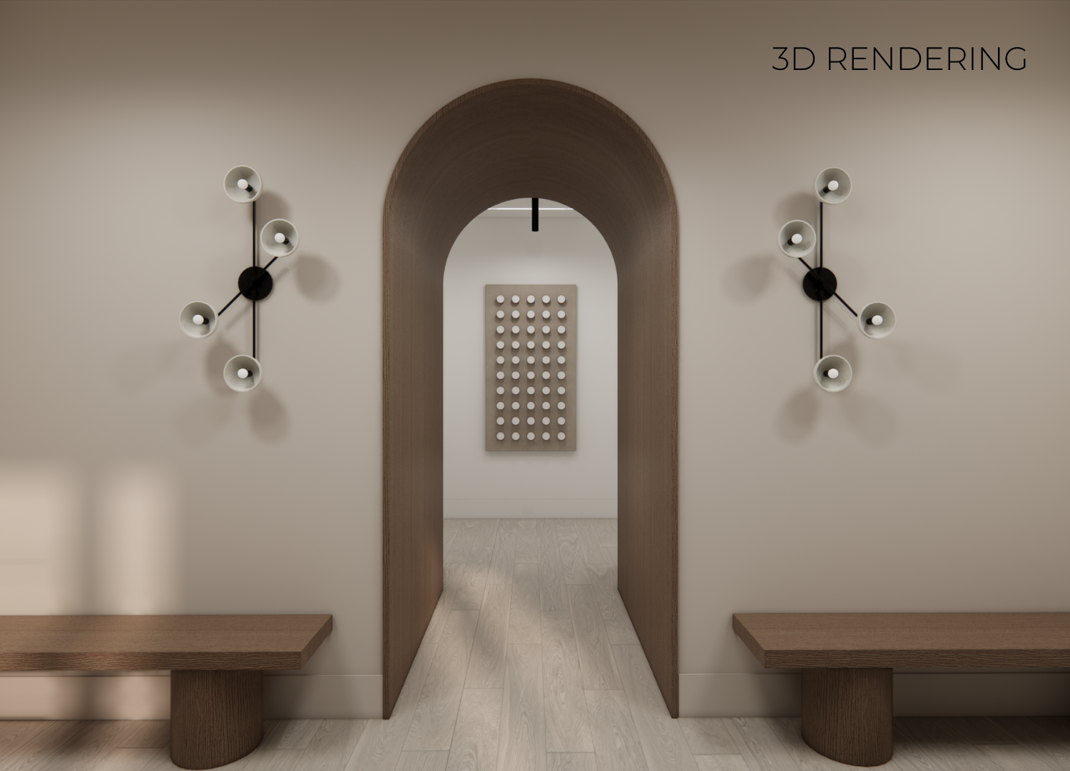 The first impression when you walk through the front door is one of quiet simplicity, and it remains one of our favorite moments in the home. The entry is divided into two parts: the first features concealed slatted closet doors on each side, with details so precise that the slats were custom-cut to accommodate the door swings. Apparatus Trapeze sconces and custom benches flank the arched opening to the second part of the foyer, where the soft light and warm materials create a sense of calm and welcome. Beyond the arch, a triptych by Bradley Duncan introduces texture and sets the tone for the rest of the house.
