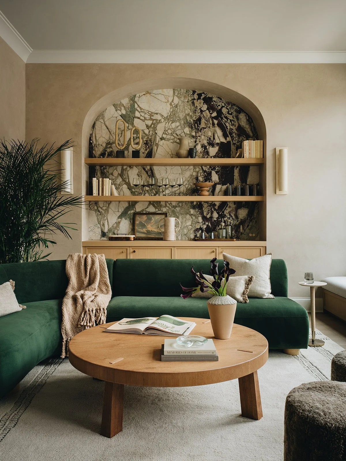 The design direction centered on restraint, materiality, and cohesion. Rather than relying on ornamentation, the home draws its presence from warm elements, natural textures, and carefully curated details. Every surface and finish was chosen to feel deliberate, from the subtle plaster walls to the rich wood tones and vibrant stone accents. An earthy palette grounds the interiors, and soft transitions between spaces allow the home to feel light, bright, and effortlessly open.