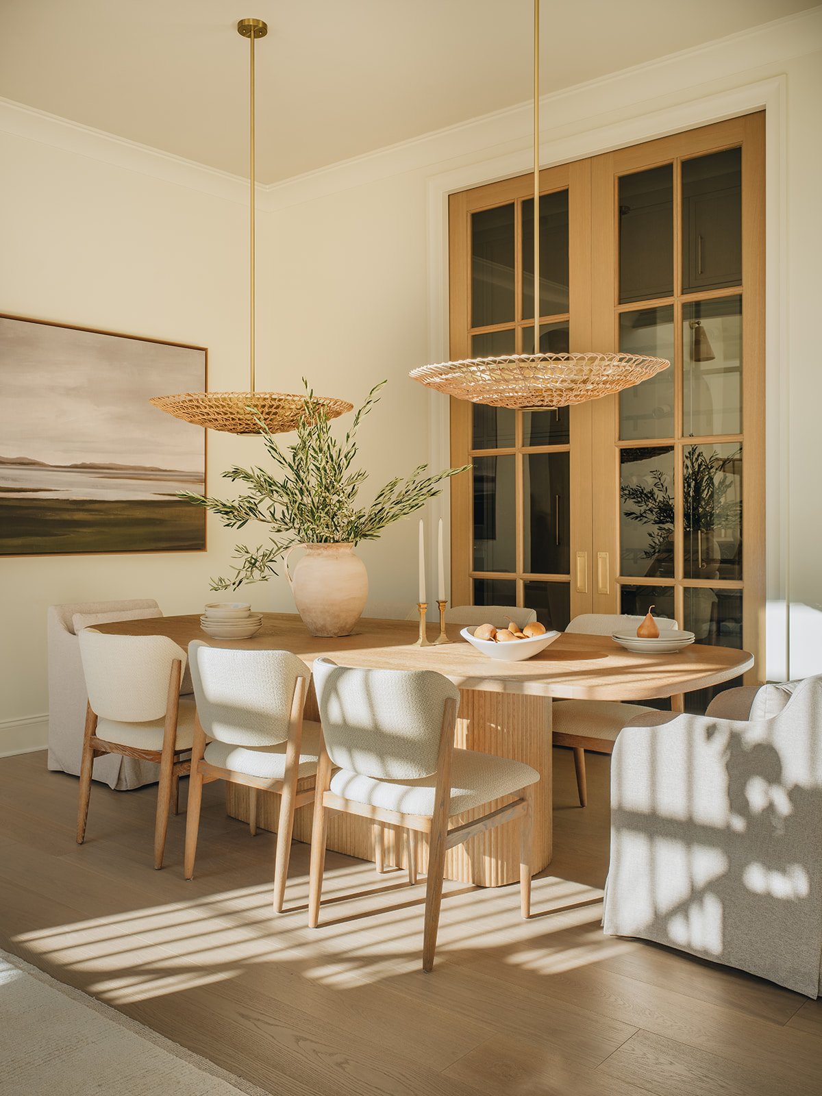 Open-concept kitchen, breakfast nook, and family room are unified through integrated materials, an earthy palette, and soft textures, with double-height ceilings and oversized woven pendants highlighting the volume
