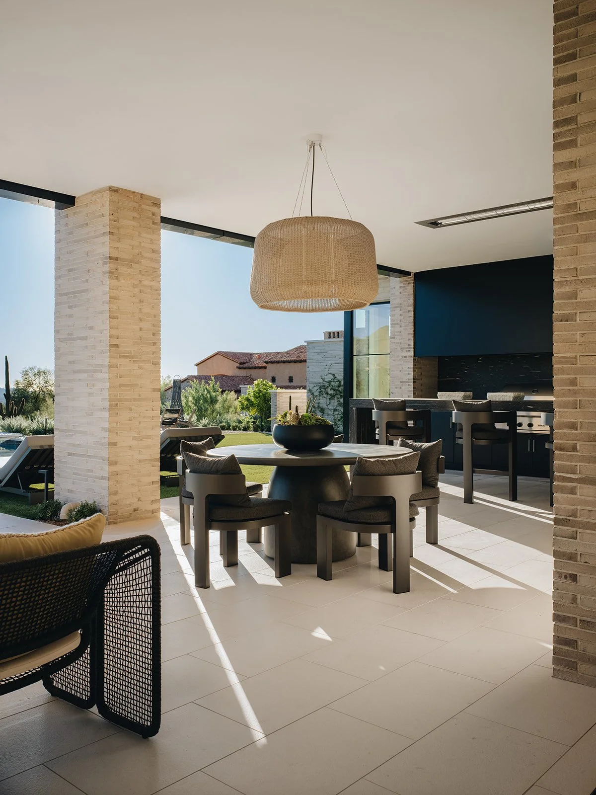 This sunlit rec room is designed for both relaxation and entertainment, featuring a custom U-shaped sectional, a sleek pool table, and personal touches like guitar hooks and framed caricatures that reflect the family’s spirit. The terrace, with its bold outdoor seating and vibrant greenery, creates a seamless flow between the interior and the sunset views beyond.